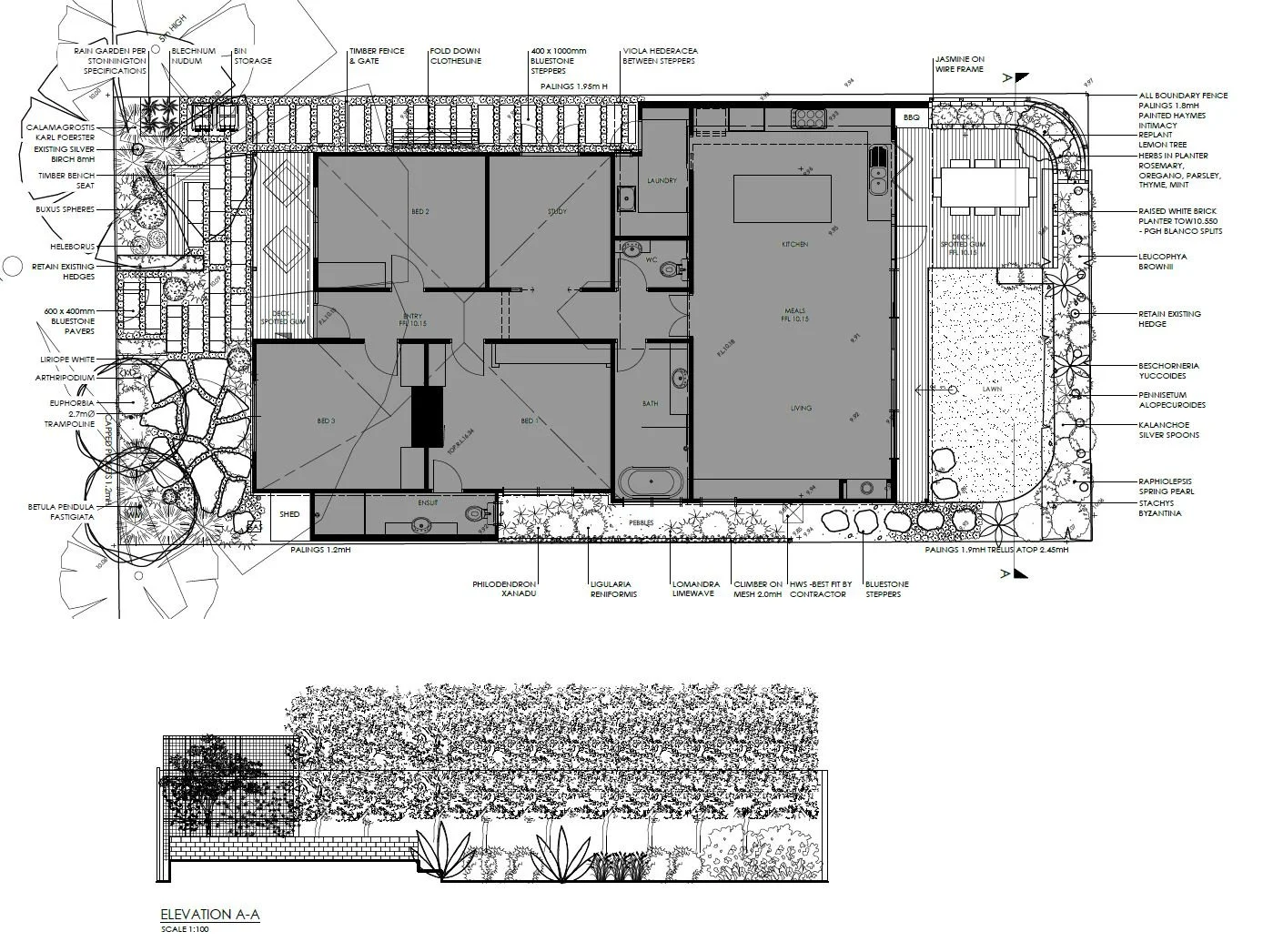 A garden designed for family. Bluestone pavers greet on arrival, where a trampoline nestles, surrounded by Euphorbia, Buxus spheres and Helebores. A timber bench seat offers parents a spot to sit whilst children play. The rear of the garden features a lush lawn flanked by outdoor dining spaces with planters filled with cascading greenery. Soft pinks, whites, and silvery tones throughout.